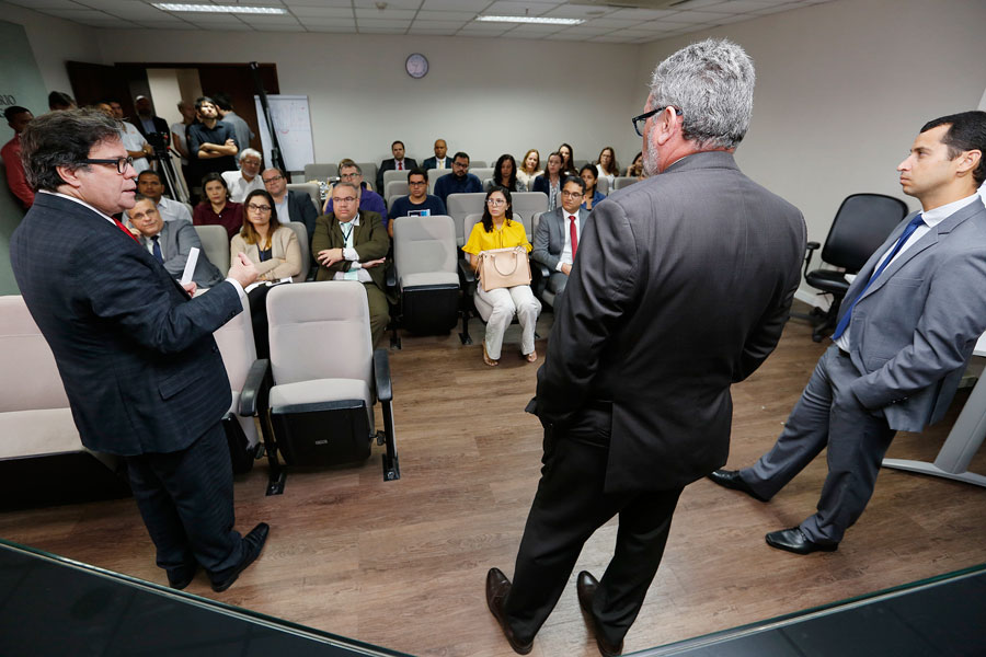 Juiz Ygor Figueirêdo, Domingos Neto e presidente Tutmés Airan durante a abertura do encontro. Foto: Caio Loureiro.